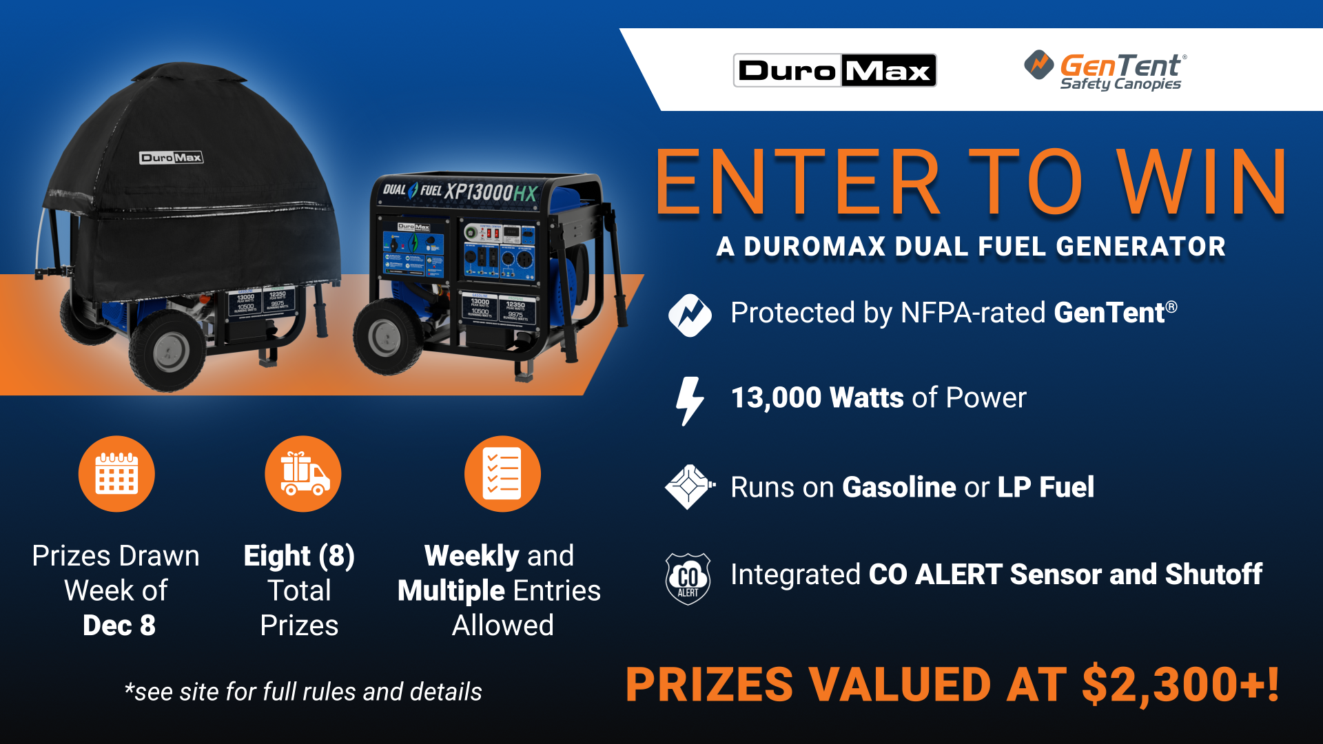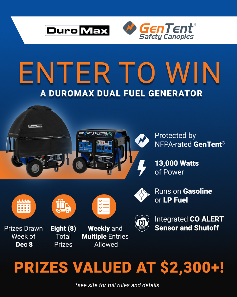 To celebrate, we’re giving away a DuroMax XP13000HX with CO Alert™, a DuroMax Generator Tent by GenTent, and a storage bag, along with 7 other prizes.