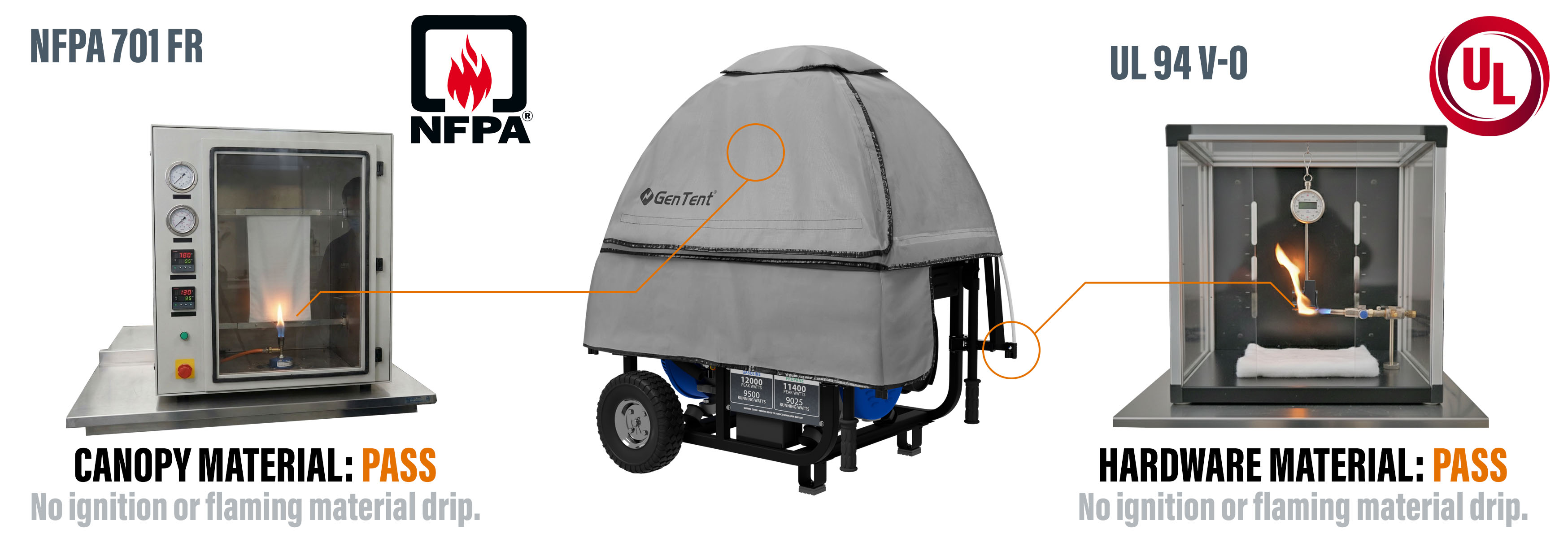 GenTent is built with certified flame-resistant materials from canopy to hardware. Independent testing confirms that GenTent materials are safer around hot, running generators.