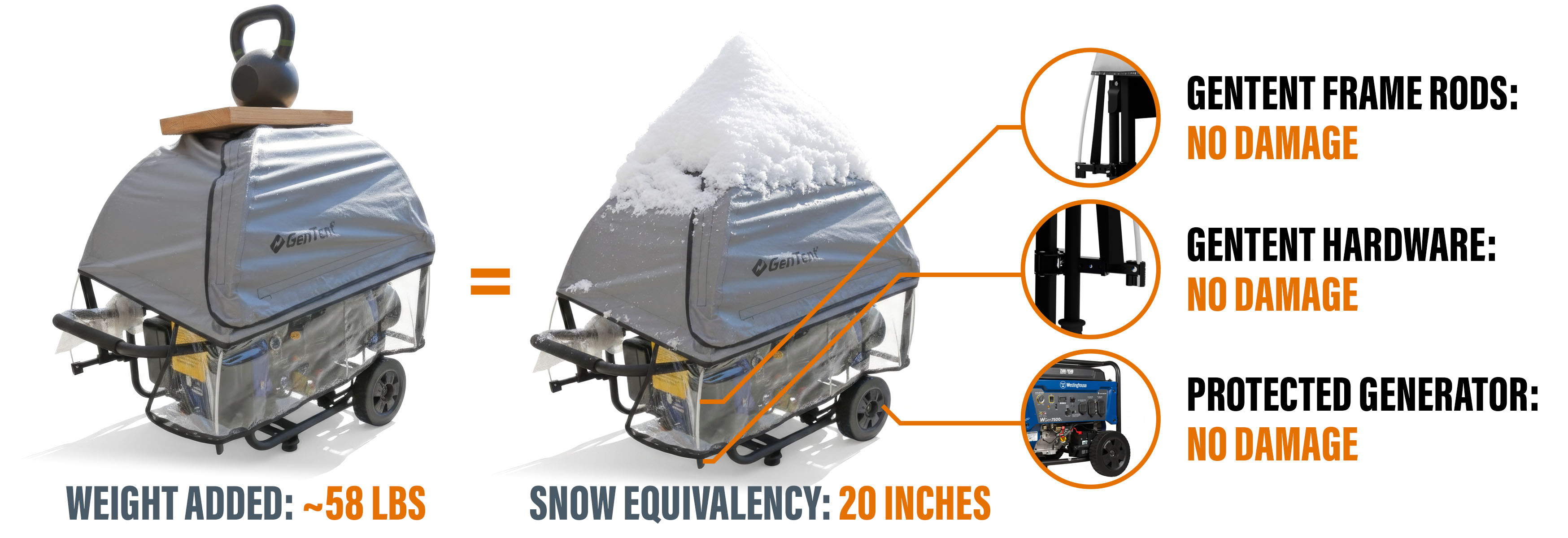 Over the 799 in2 area covered by the GenTent, 55.5 LBS would be equivalent to the mass of 1.905” of water at 0 °C. Assuming a 10:1 ratio, a wet and heavy snow, 1.9” of water would be equivalent to 19” of snow distributed over the entire canopy surface.