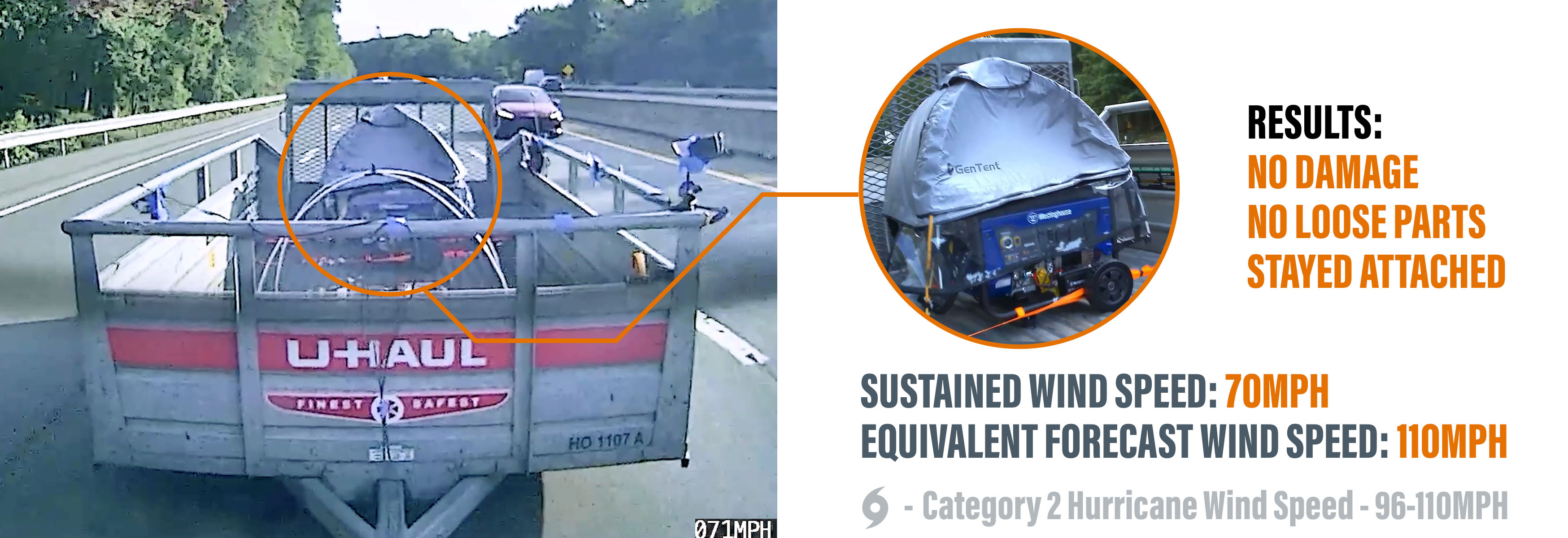 Generators equipped with GenTent covers were mounted on an open utility trailer and driven at highway speeds over 70 MPH, creating sustained wind forces equivalent to about 110 MPH forecast winds: the kind seen in severe blizzards or strong Category 2 hurricanes.